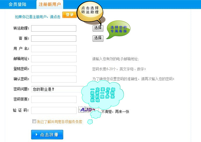 2,進(jìn)入注冊(cè)頁(yè)面后,選擇你的轉(zhuǎn)運(yùn)助理和客服,并填寫會(huì)員基本信息: