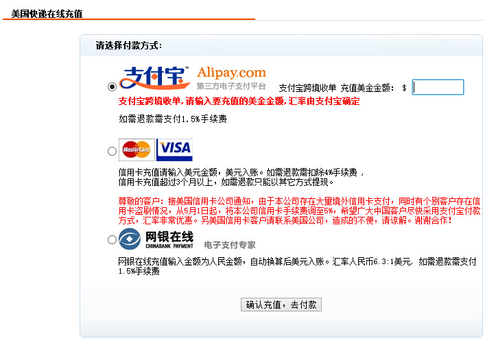 美國快遞采取“先充值,后發(fā)貨”的方式,需要會員先行在賬戶充值,貨物在美國倉庫稱重并處理好,會自動在會員賬戶扣費,然后發(fā)貨。所以請保持賬戶有足夠的余額,以免減慢物流的速度。
